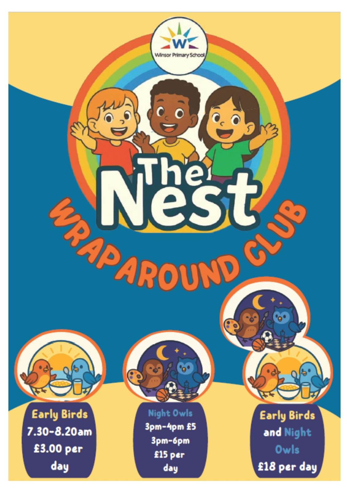 Based at the front of the school close to the main entrance and run by dedicated Winsor staff, The Nest provides wrap-around care with Early Birds - breakfast club and Night Owls - after school club.